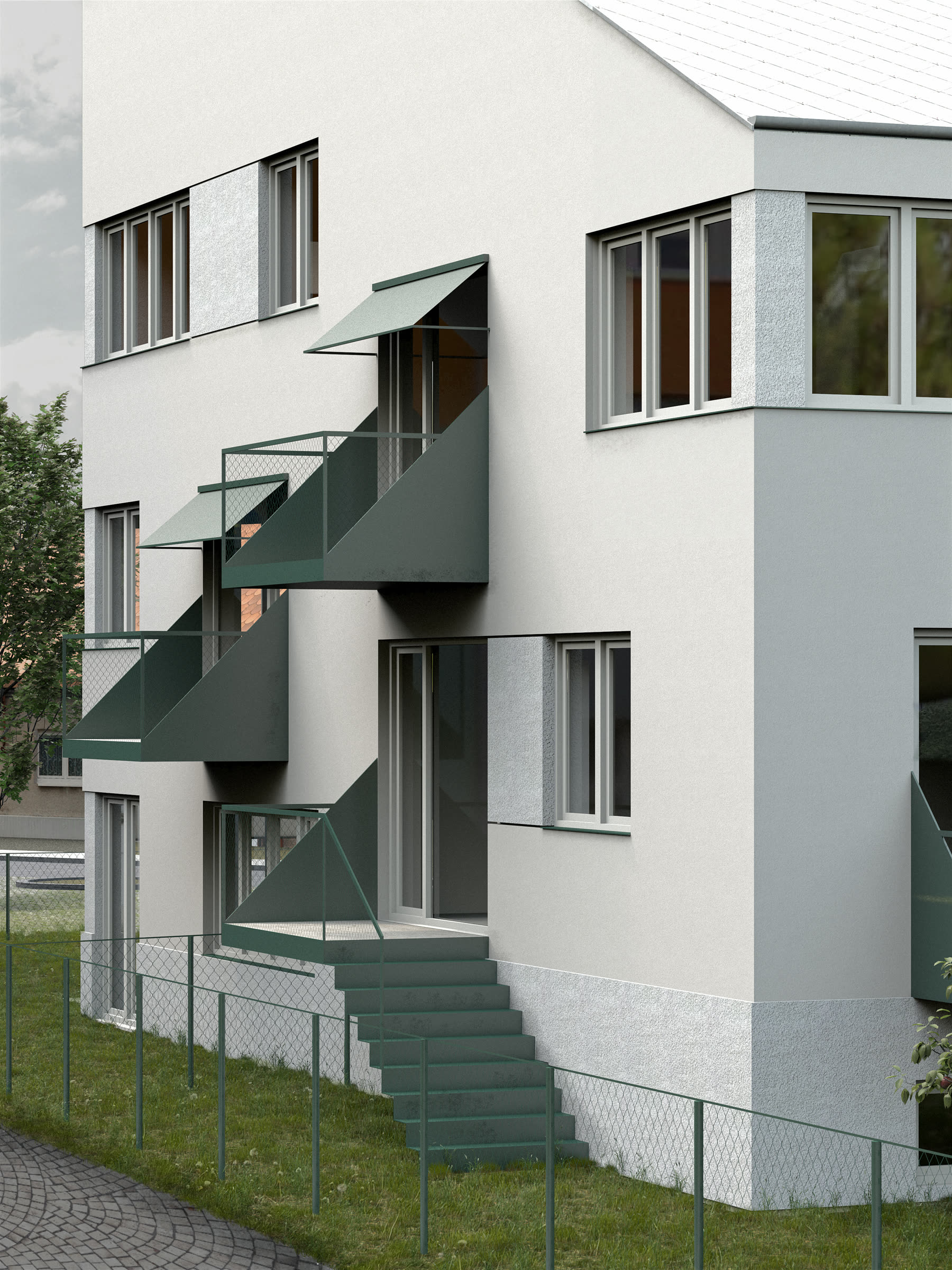 Velikost otvorů na fasádě vychází z modernistických pásových oken na budově školy v kombinaci s členěním menších okenních otvorů na okolních rodinných domech.