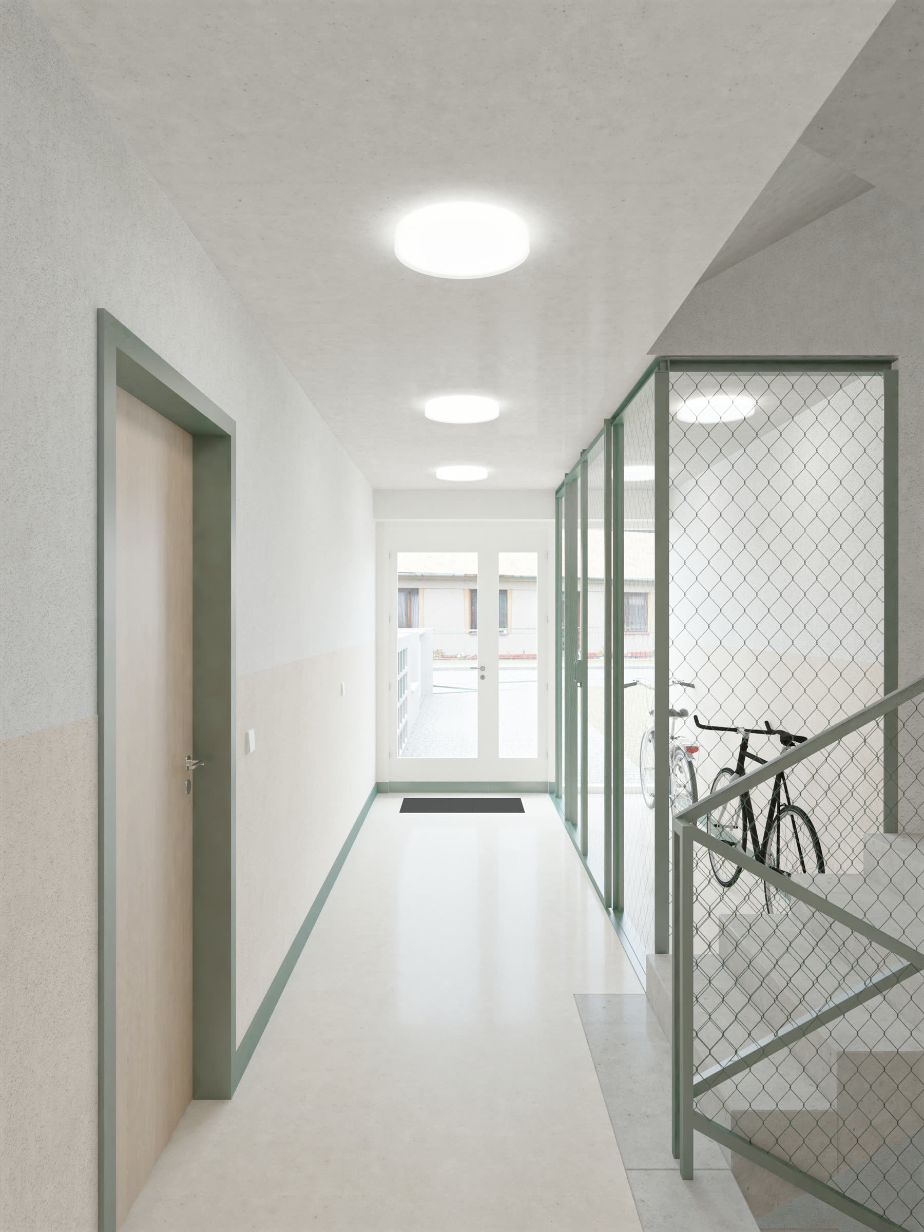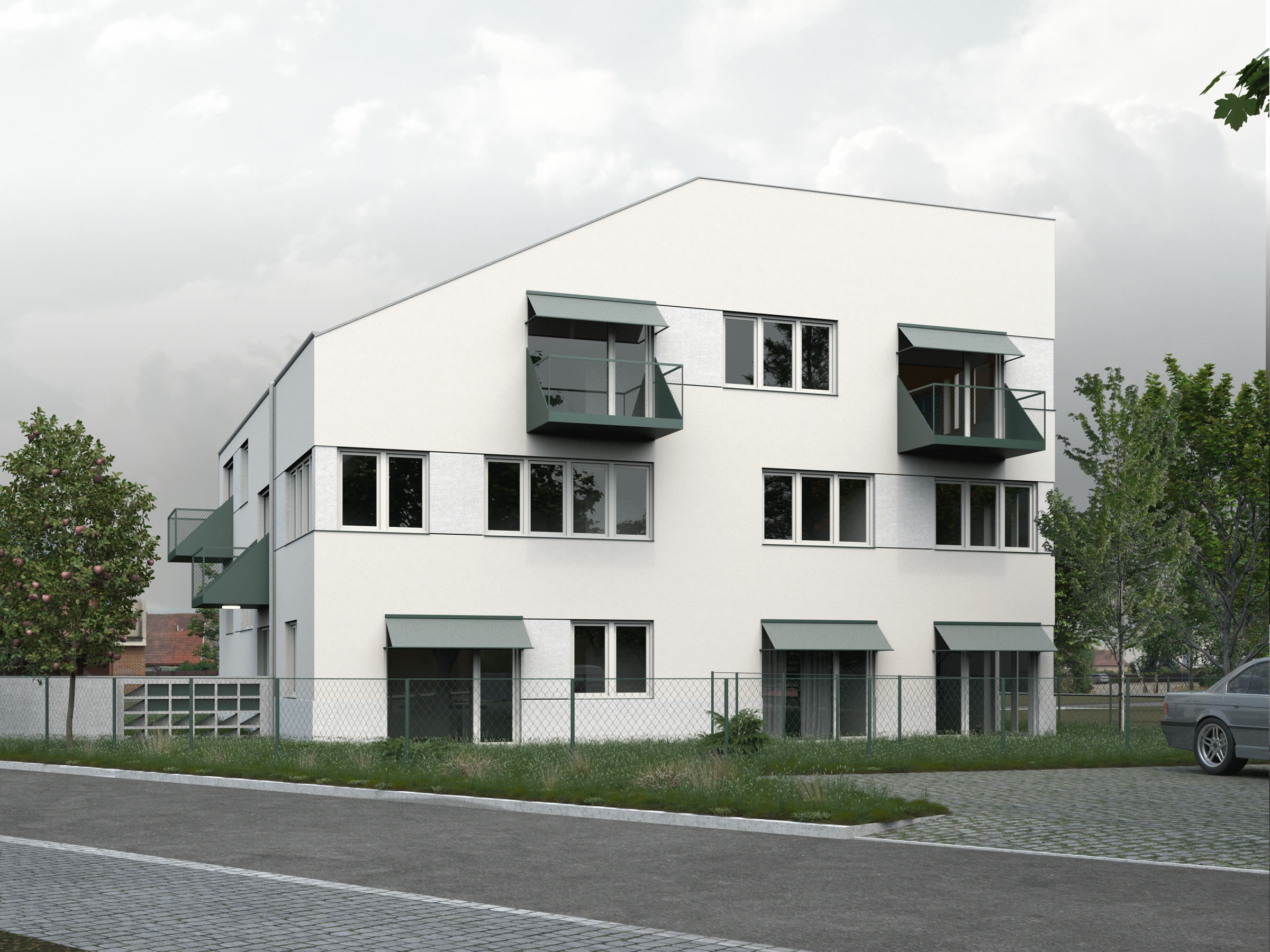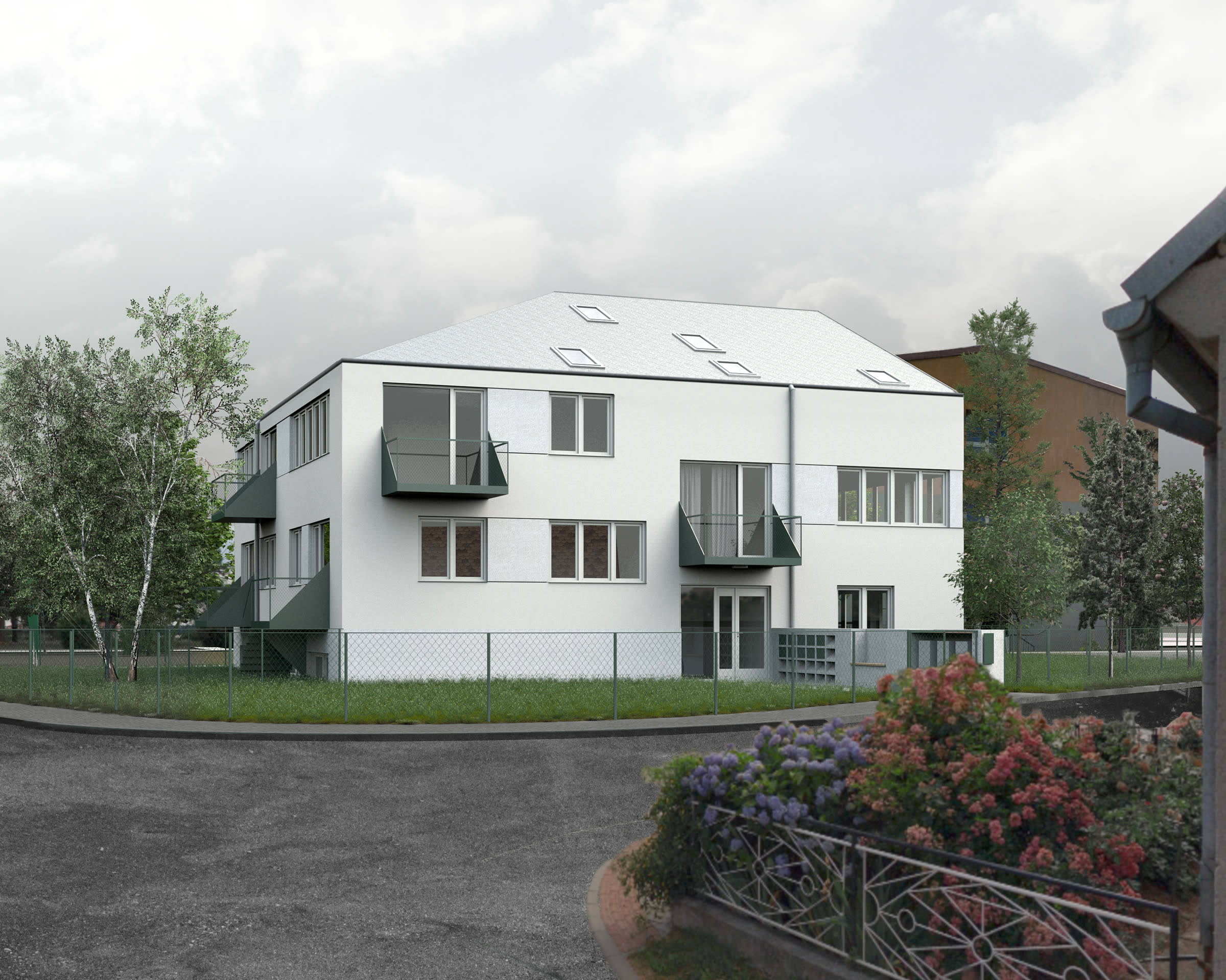 Rekonstrukce původního domu pro učitele se 4 bytovými jednotkami přinesla příležitost dům nastavět a vytvořit tak dalších 6 bytových jednotek ve standardu bydlení odpovídajícím současnosti. Byty jsou vždy orientované na 2 světové strany a nabízí modularitu rozdělení obytných místností na menší pokoje. Věnovali jsme se ale také okolnímu prostoru domu a navrhli jsme jeho rozdělení, tak aby si obyvatelé mohli osvojit prostor kolem domu a nešlo tak jen o zbytkový prostor, který musí obec udržovat.