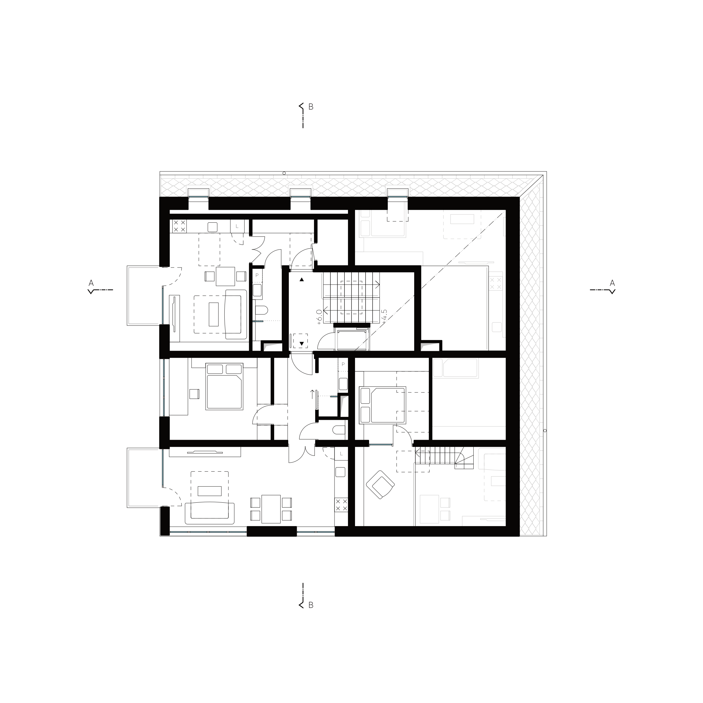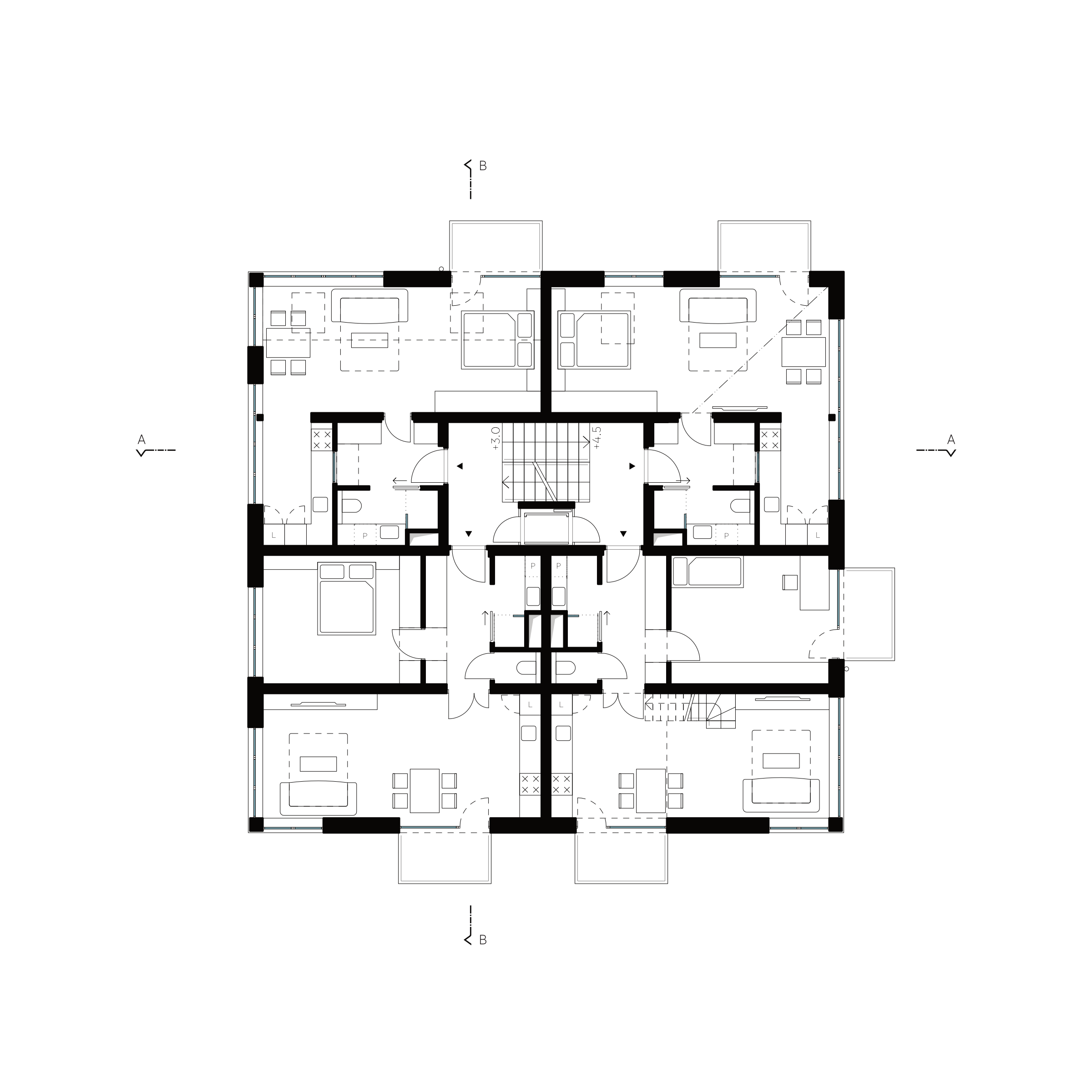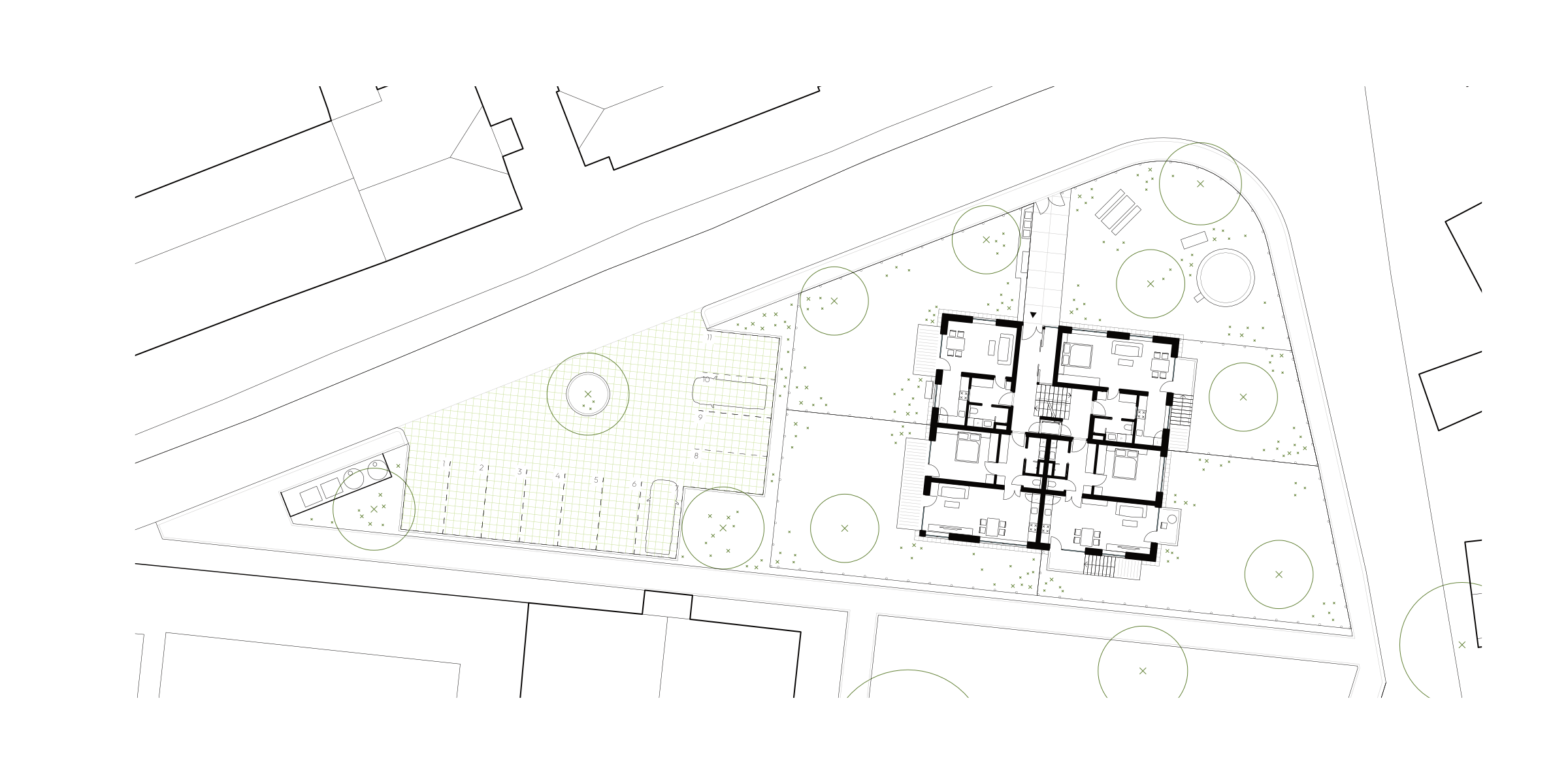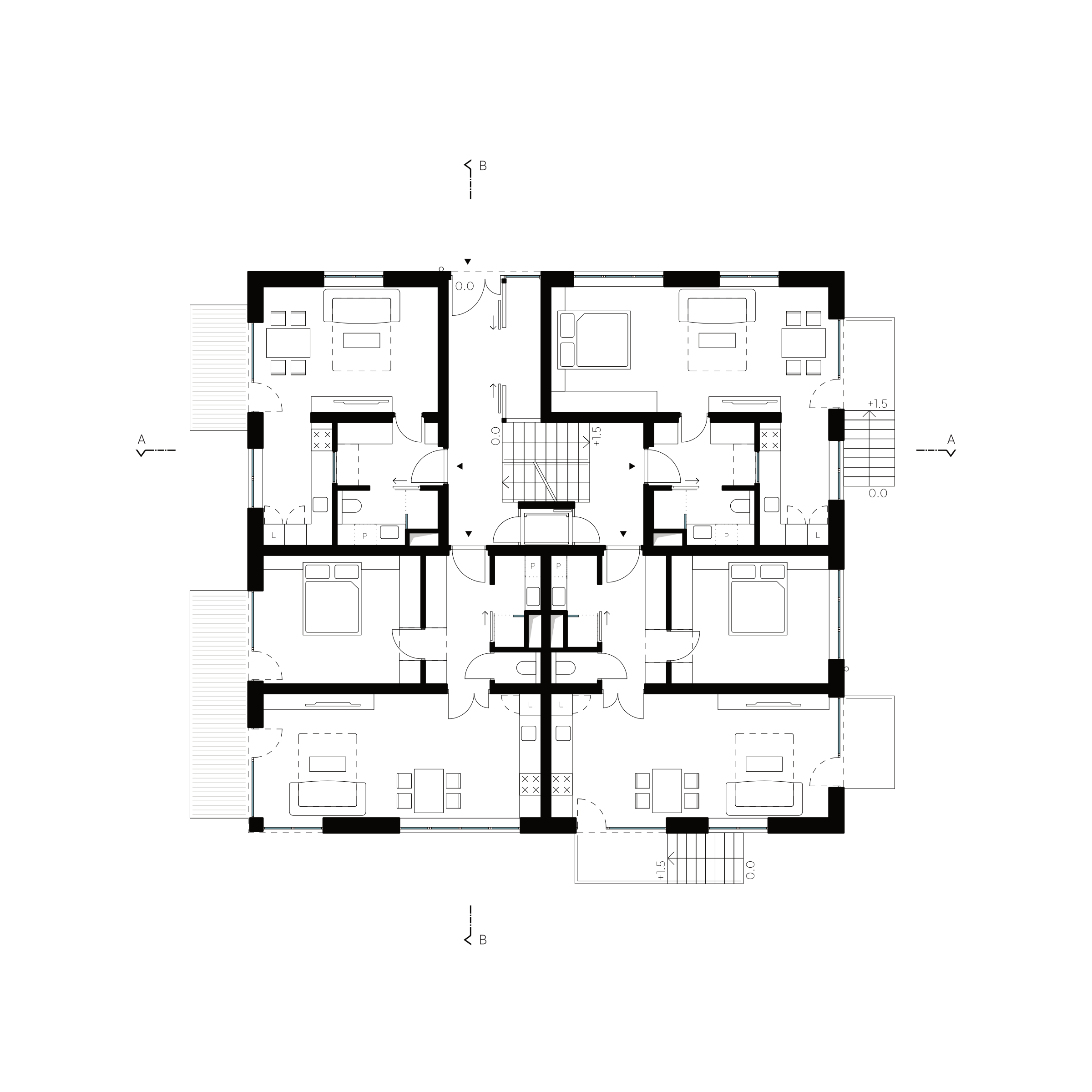 Rekonstrukce původního domu pro učitele se 4 bytovými jednotkami přinesla příležitost dům nastavět a vytvořit tak dalších 6 bytových jednotek ve standardu bydlení odpovídajícím současnosti. Byty jsou vždy orientované na 2 světové strany a nabízí modularitu rozdělení obytných místností na menší pokoje. Věnovali jsme se ale také okolnímu prostoru domu a navrhli jsme jeho rozdělení, tak aby si obyvatelé mohli osvojit prostor kolem domu a nešlo tak jen o zbytkový prostor, který musí obec udržovat.