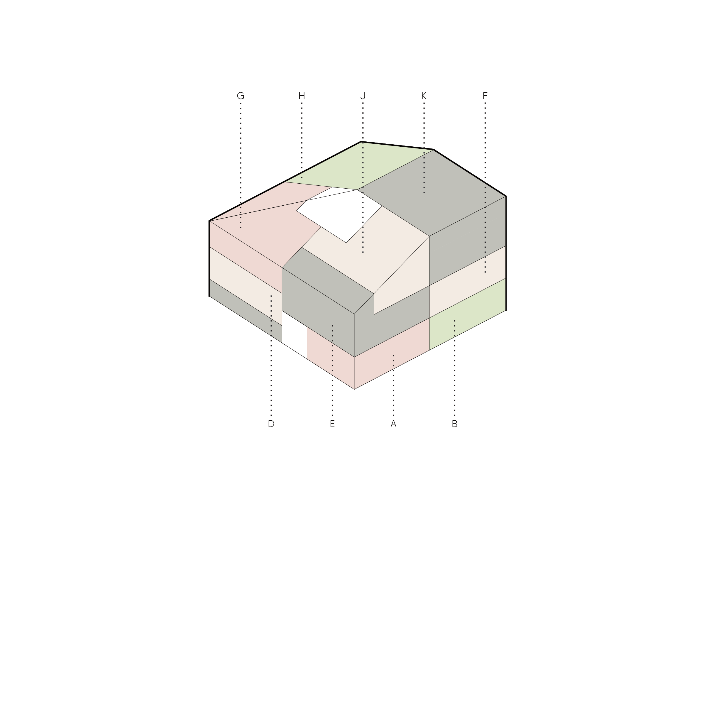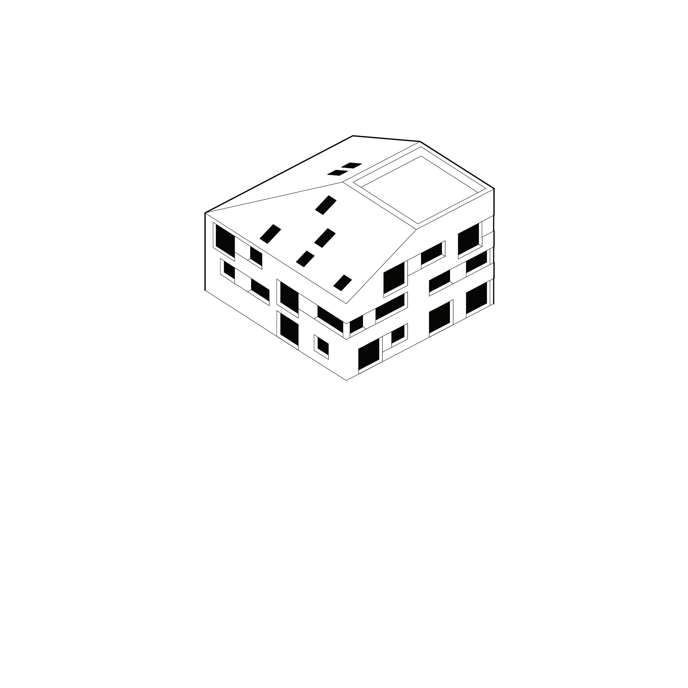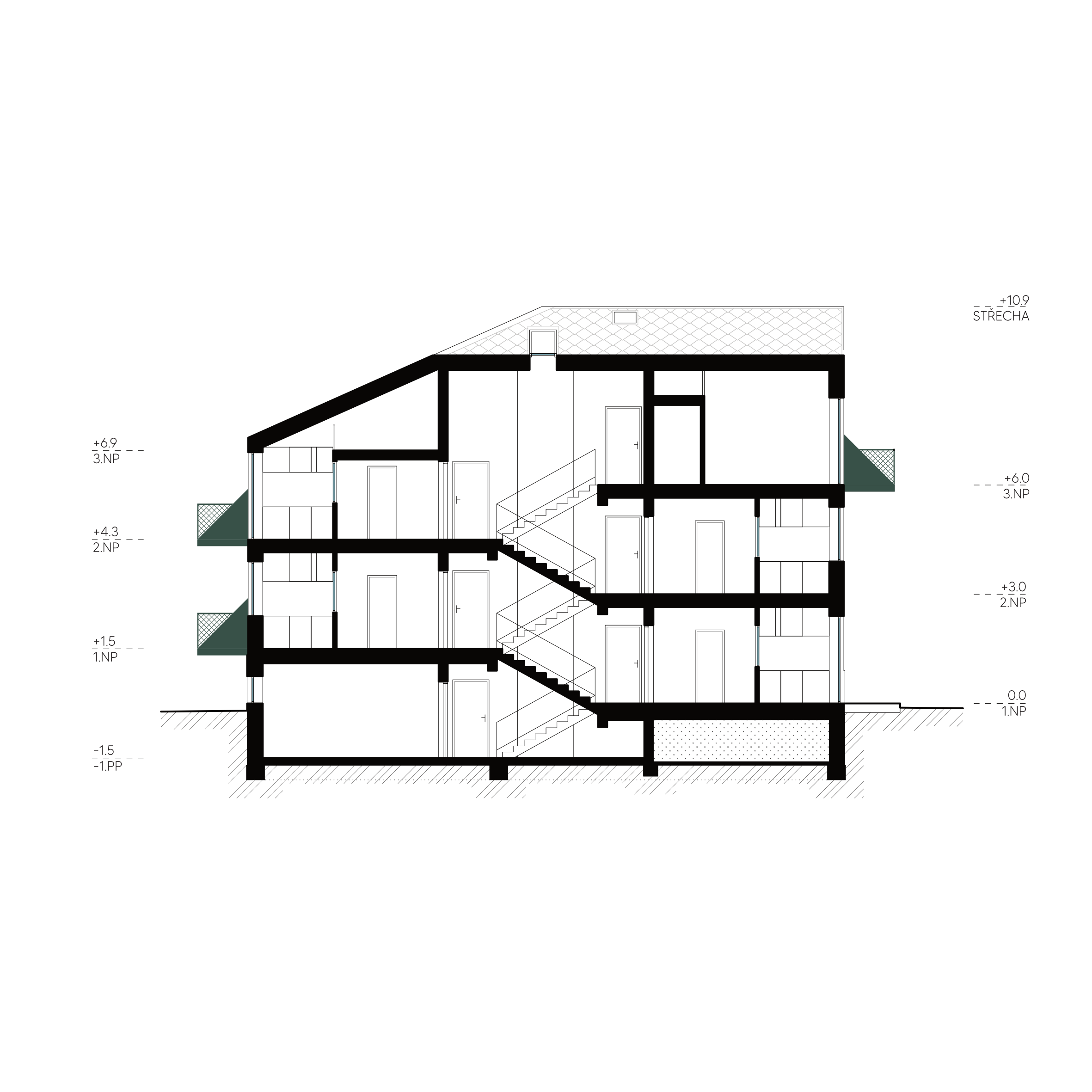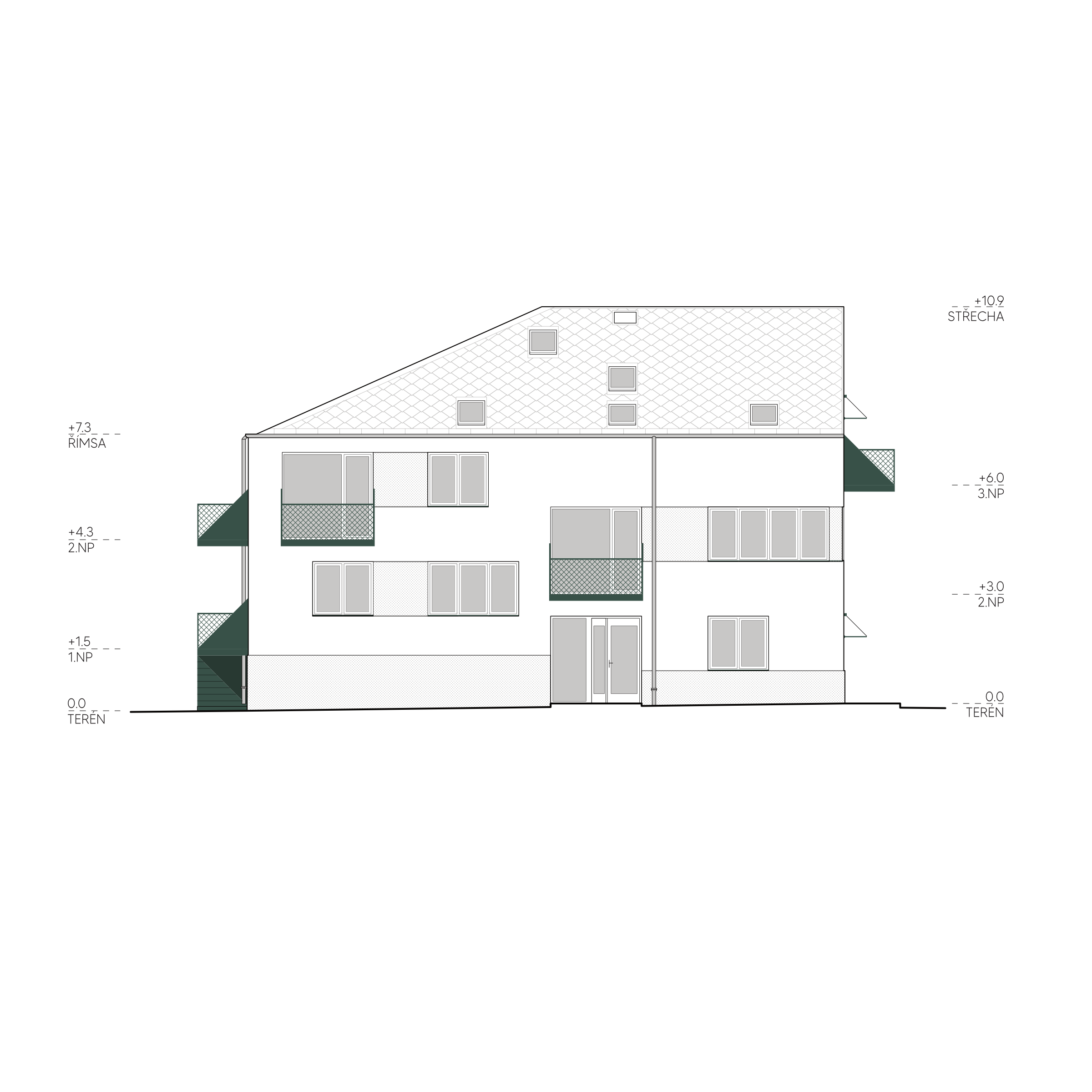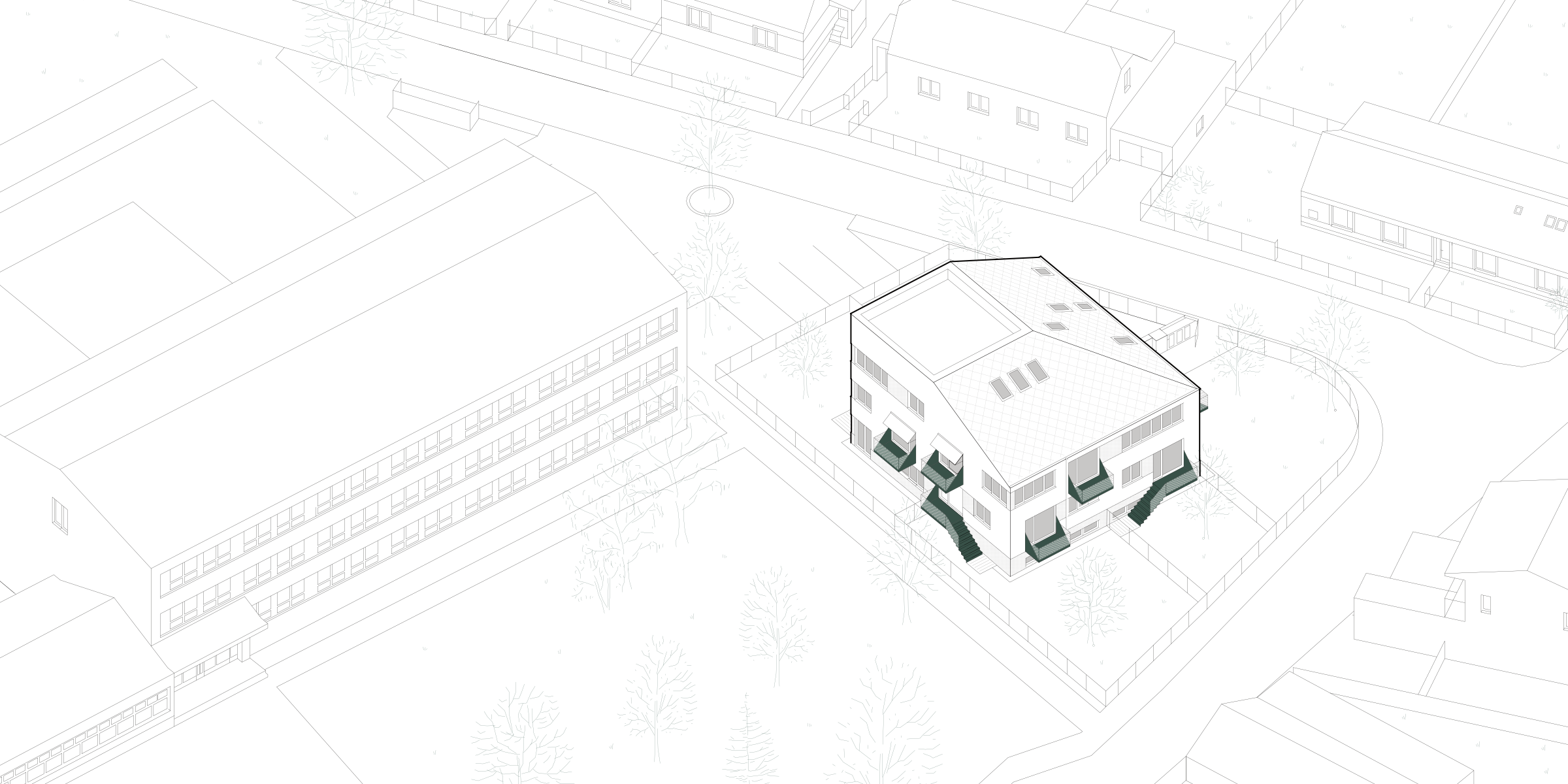Hmotové řešení pracuje s podlažností okolních budov, z jedné strany je dům rámován 3 podlažní modernistickou základní školou a naopak naproti přes ulici má dům nízké sousedy. Proto se i silueta domu přizpůsobuje těmto sousedům a k ulici se chová jako dům se šikmou střechou, zatímco směrem ke škole má dům plnohodnotné 3 podlaží.