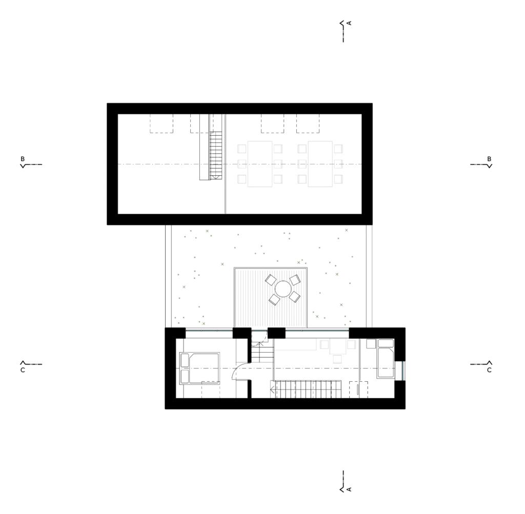 Do jižní útlé a převýšené budovy byl vmístěn dvoupodlažní apartmán. Severní halový prostor je věnován klubovně s kuchyní, zadní část myslivně. Tento prostor má zároveň nejlepší návaznost na severní travnatou plochu, na které je možné za dobrého počasí konat slavnosti a klubovnu použít jako zázemí. Doprostřed obou štítů byla vložena knihovna.
