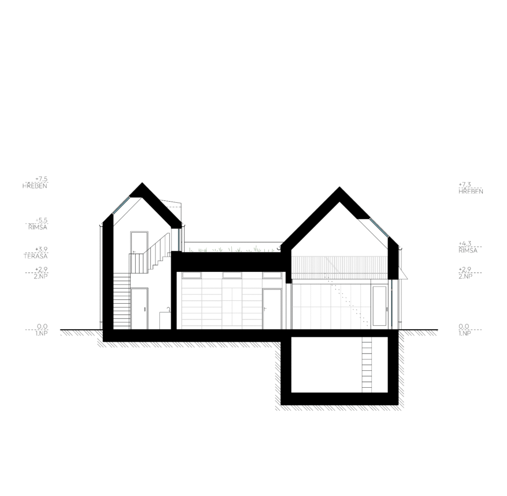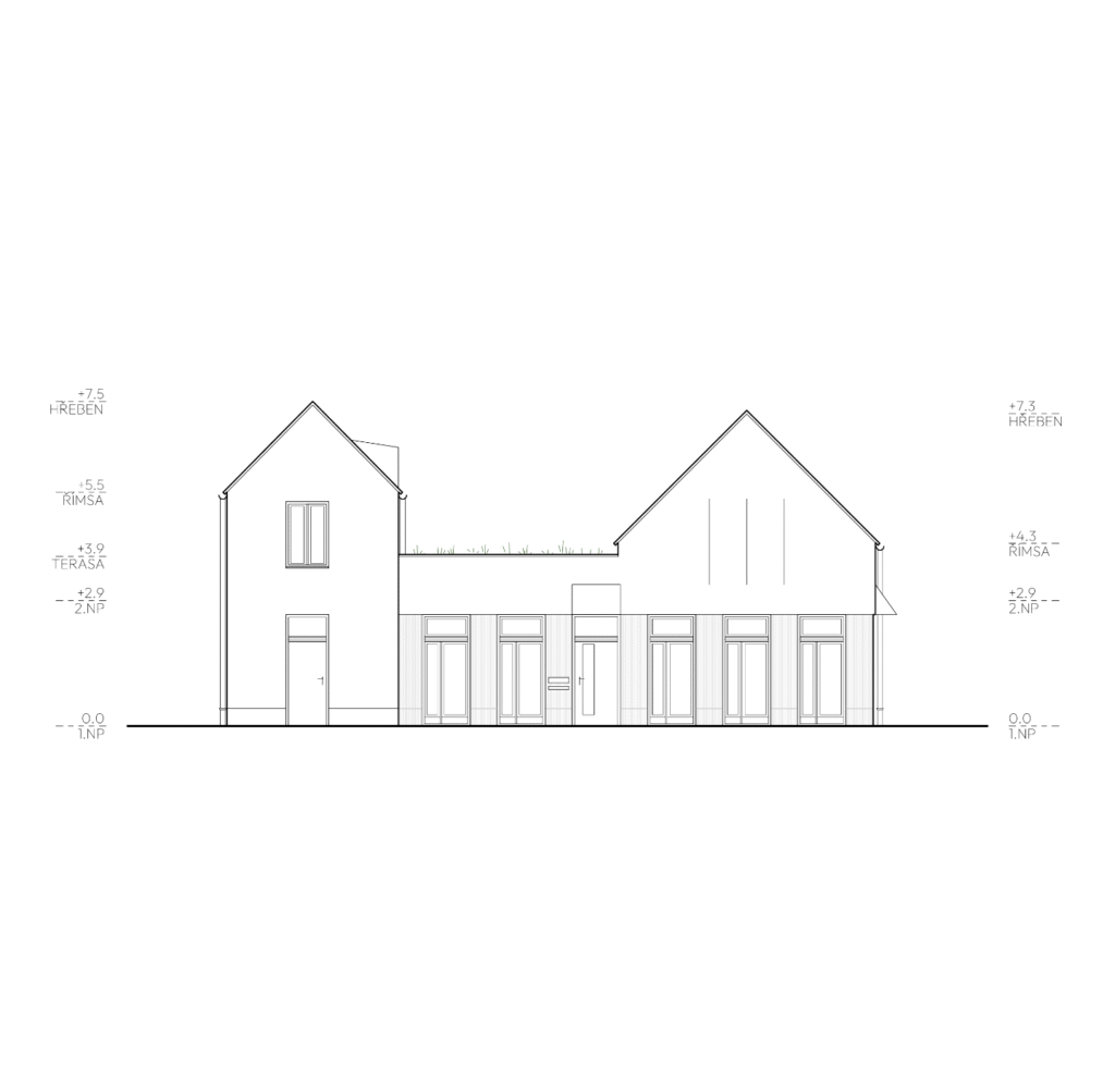 Základní hmotové řešení se inspiruje v místním archetypu dvouštítového řešení. Tyto dvě sedlové střechy zároveň rámují výhled na nedaleký chlum 456. Mezi nimi je hmota vyplněna nízkým kvádrem s plochou střechou.