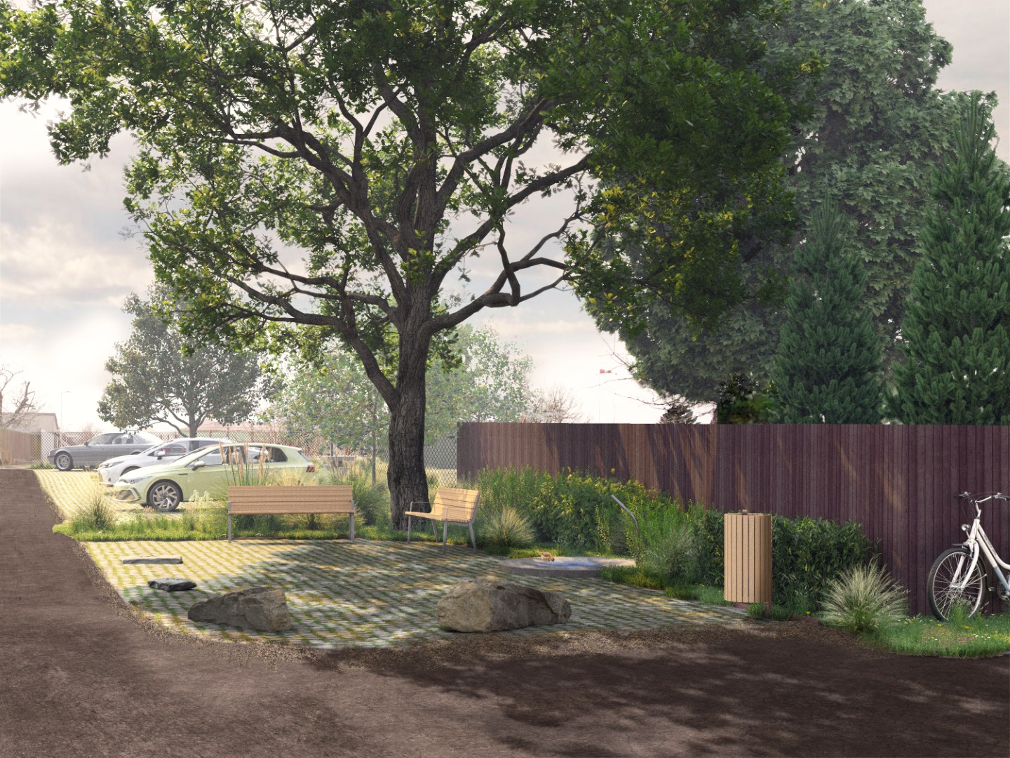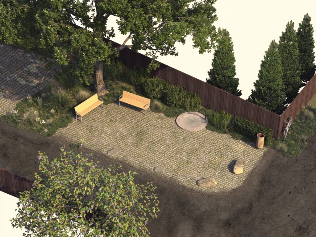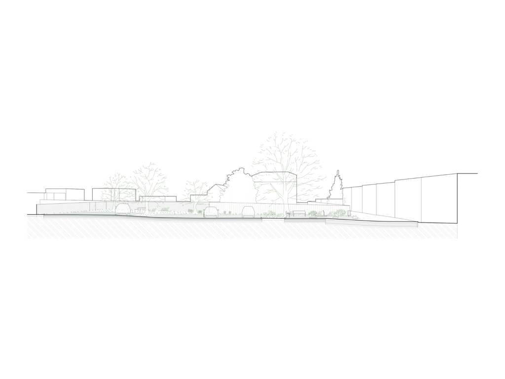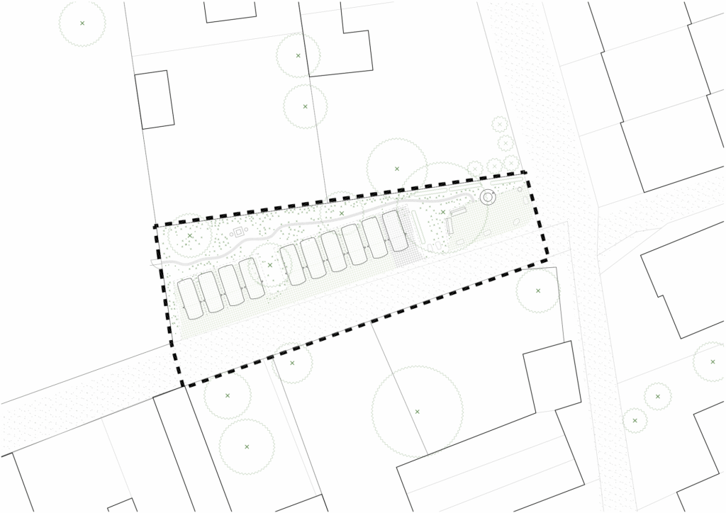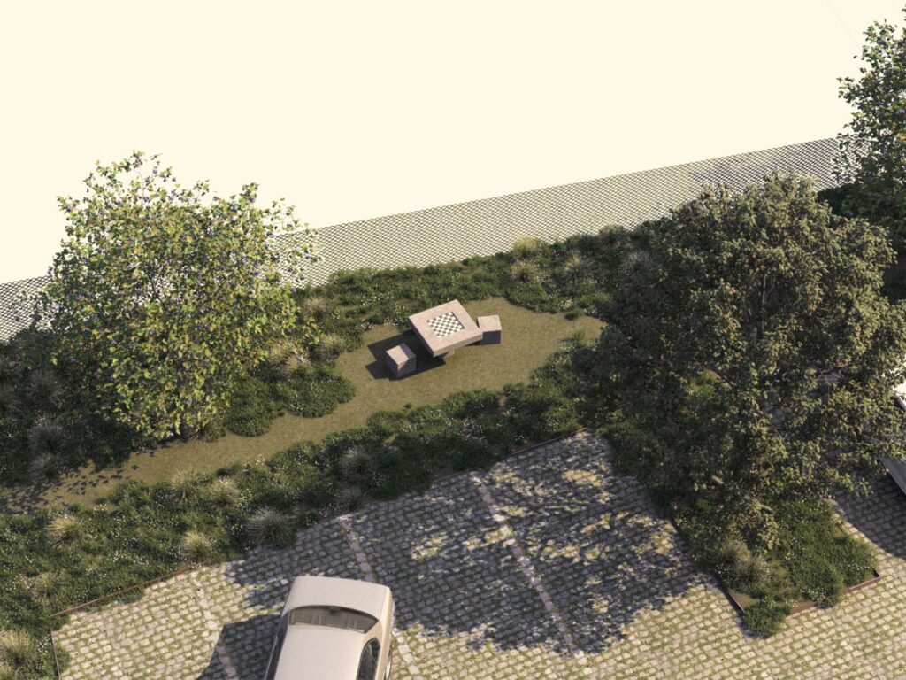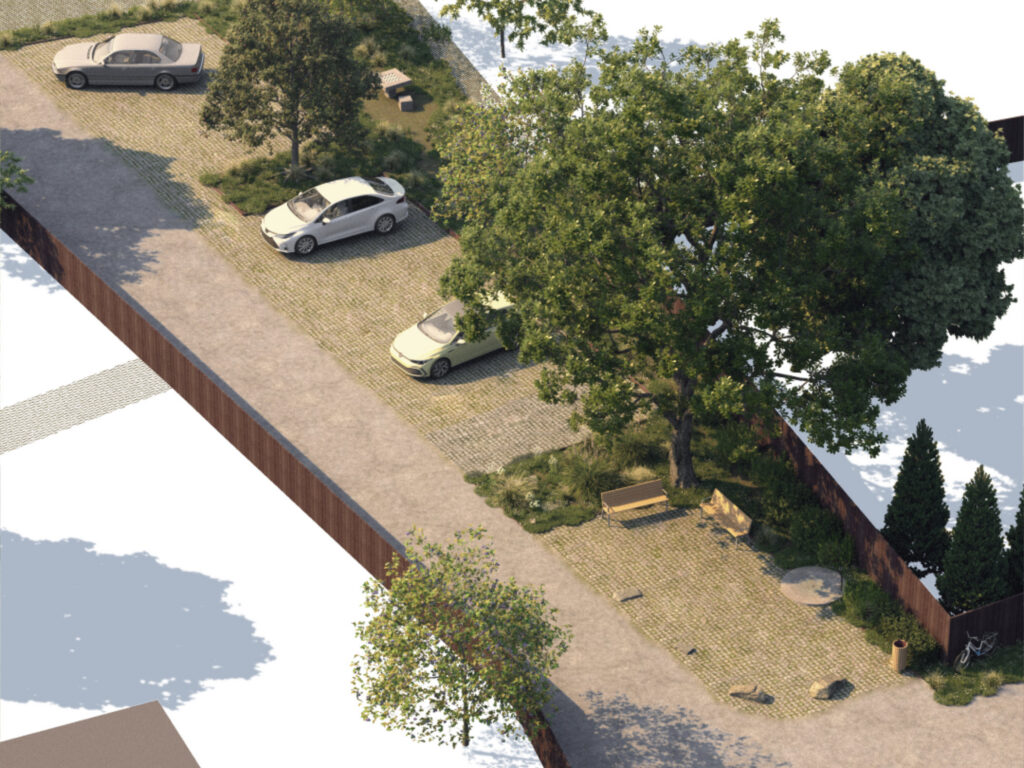 Při návrhu parkoviště u školky jsme se snažili přinést mimo parkování do veřejného prostoru i další hodnotu. Vytvořili jsme proto prostor na nároží, který slouží obyvatelům obce jako místo pro setkávání, hru a odpočinek. Obzvlášť důležitá pro nás byla volba povrchů a jejich rozhraní, tak aby nenarušovaly venkovský charakter okolí. Dlažba se širokými spárami, schopná retence vody je doplněná o záhony se vzrostlými květy a stromy, které poskytují stín a vytváří dominantu na nároží.